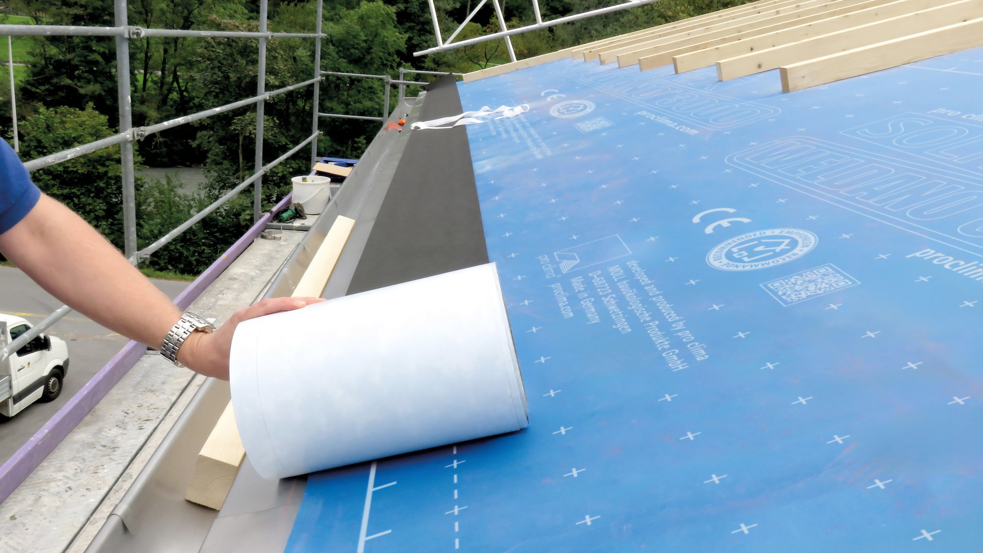 Reinig het dakvoetprofiel en verlijm de onderkant van de SOLITEX WELDANO 3000-dakfolie met ORCON CLASSIC.