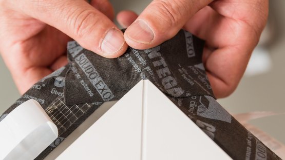 Om ervoor te zorgen dat de band later eenvoudig en betrouwbaar met de dagkant van het raam kan worden verlijmd, moeten de hoekvouwen op de hier getoonde wijze worden gemaakt en moet CONTEGA SOLIDO IQ-D rondom worden verlijmd.